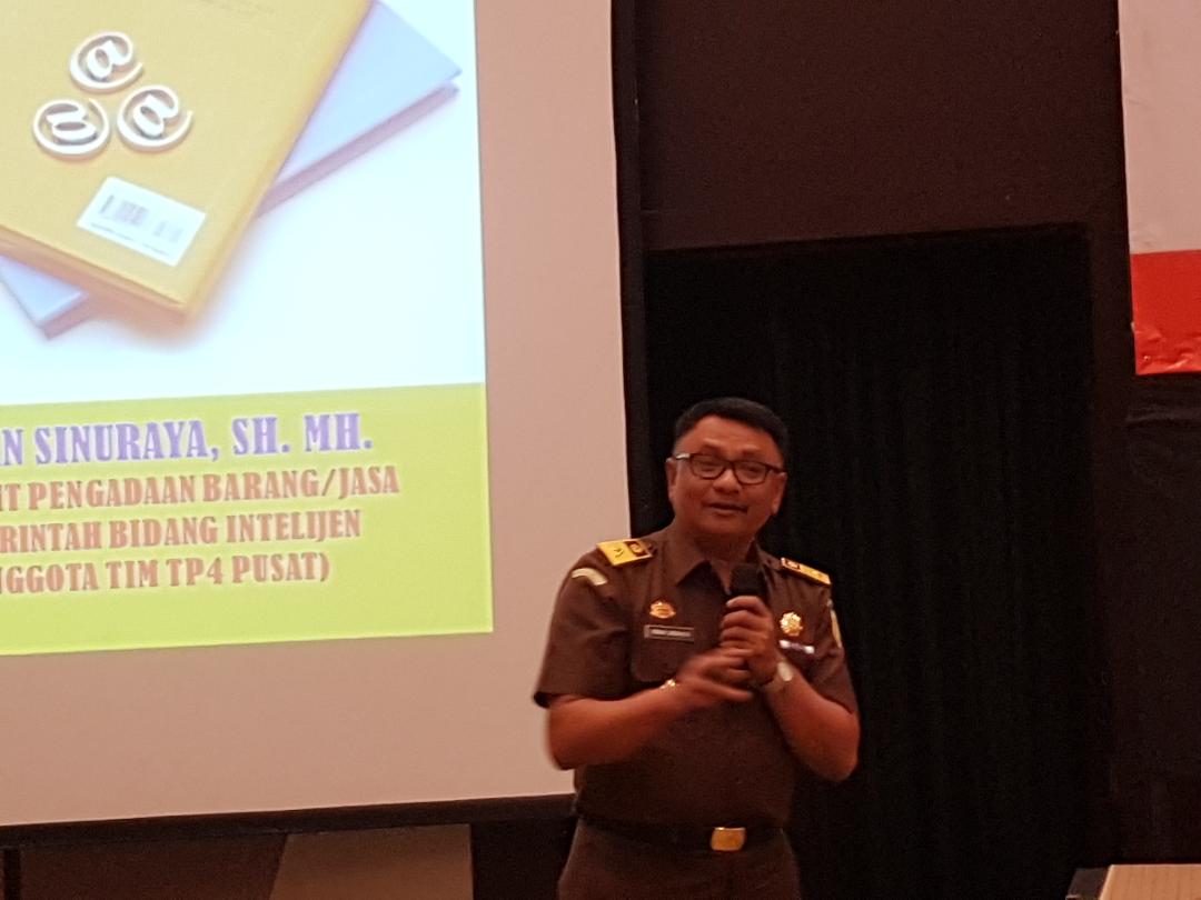 Kepala Sub bidang Direktorat Barang/Jasa Pemerintahan bidang Intelijen dan Anggota Tim Pengawal dan Pengamanan Proyek-Proyek Pemerintah (TP4) Kejaksaan RI, Irwan Sinuraya, memberikan penjelasan mengenai pengawalan dan pengamanan untuk proses pengadaan logistik Pemilihan ...