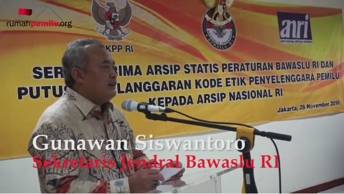 “Kami (Bawaslu) menyadari pengarsipan data menjadi sangat penting, ungkap ketua Bawaslu RI Prof Dr Muhammad. Maka dari itu Bawaslu kini mulai mempersiapkan sistem dan tempat pengarsipan yang lebih baik. (28/11/16)Bawaslu Mendorong Pengarsipan Data Secara Profesional