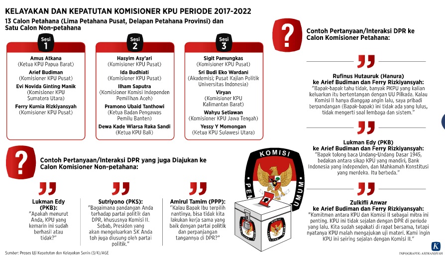 JAKARTA, KOMPAS — Uji kelayakan dan kepatutan calon anggota KPU periode 2017-2022 di DPR, Senin (3/4), menjadi ajang bagi partai politik mencari penyelenggara pemilu yang dapat diajak bekerja sama jelang Pemilu 2019. Di tengah upaya intervensi itu, KPU mendatang diharapkan tetap menjaga independensi dan kemandiriannya.