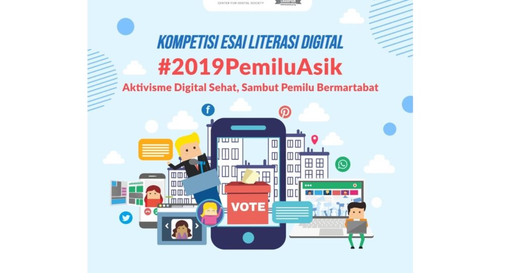 Center for Digital Society (CfDS) Universitas Gadjah Mada (UGM) mengadakan lomba esai literasi digital dengan tema “2019 Pemilu Asik: Aktivisme Digital Sehat, Sambut Pemilu Bermartabat”. Lomba diperuntukkan bagi mahasiswa aktif jenjang diploma atau sarjana dari perguruan tinggi di Indonesia, berkewarganegaraan Indonesia, dan bersedia mengikuti akun Instagram dan/atau Twitter CfDS, yakni @cfds_ugm.