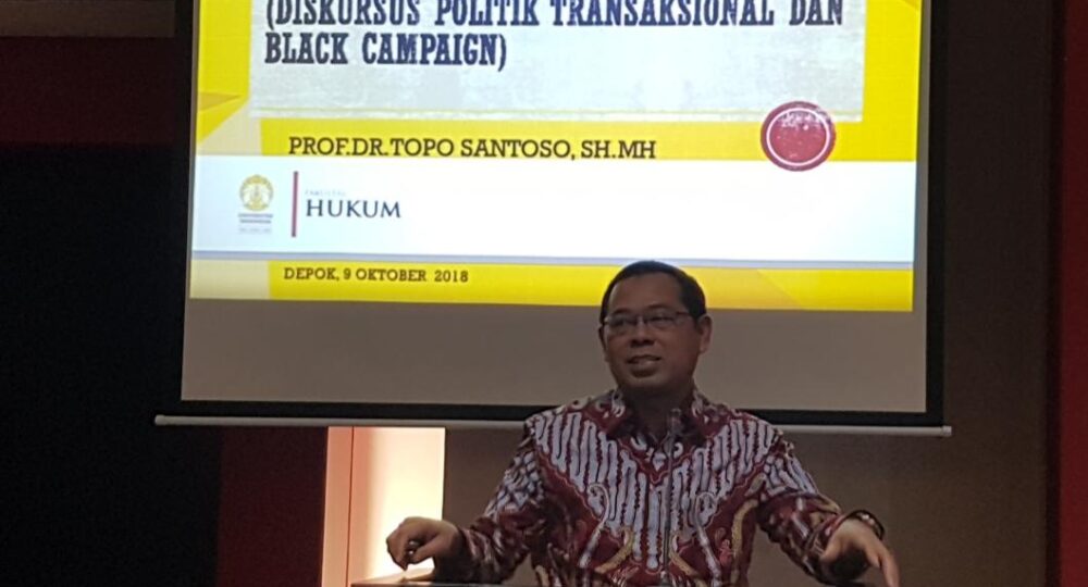 “Kampanye negatif ini aspek hukumnya sah saja. Bahkan, itu berguna membantu pemilih membuat keputusannya. Misal, ada berita yang menunjukkan data-data, misal hutang luar negeri, itu sah dan bisa saja dikeluarkan. Pemilih akan lebih cerdas memilih,” jelas Topo pada seminar “Politik Transaksional, Korupsi Politik, dan Kampanye Hitam pada Pemilu 2019 dalam Tinjauan Hukum Pidana” di gedung Fakultas Hukum UI, Depok, Jawa Barat (9/10).